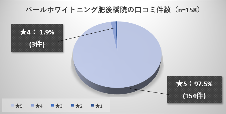 最初にパールホワイトニング大阪肥後橋院に対する約150人の口コミを調査した結果の全体像を俯瞰しましょう。(引用:Googleマップ)