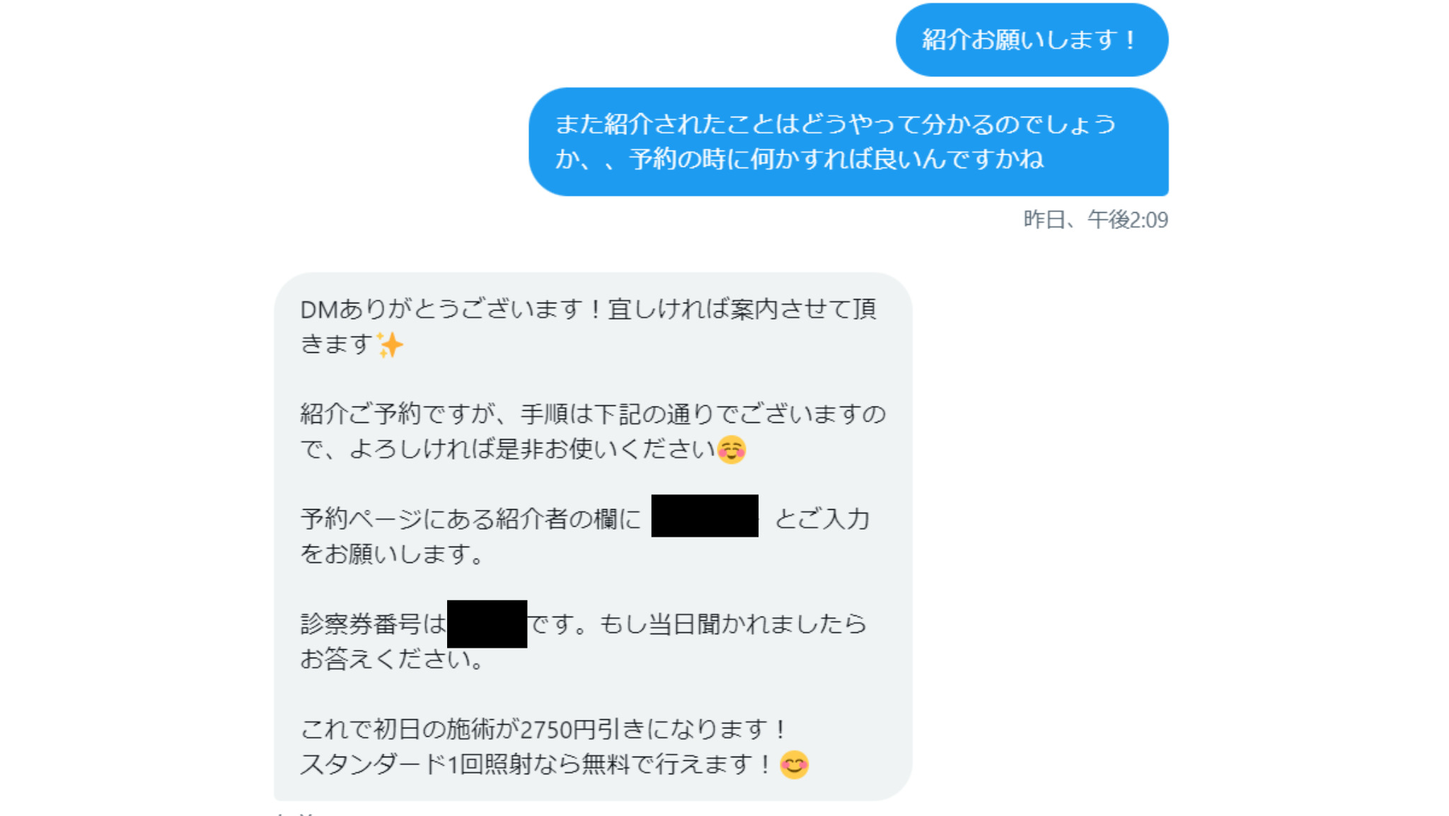 診察券番号は××です。もし当日聞かれましたらお答えください。これで初日の施術が2750円引きになります!スタンダード1回照射なら無料で行えます!😊