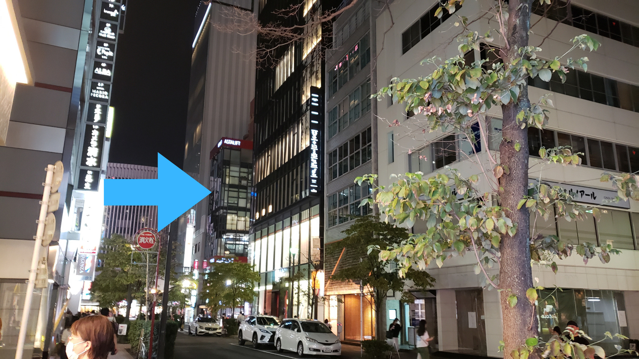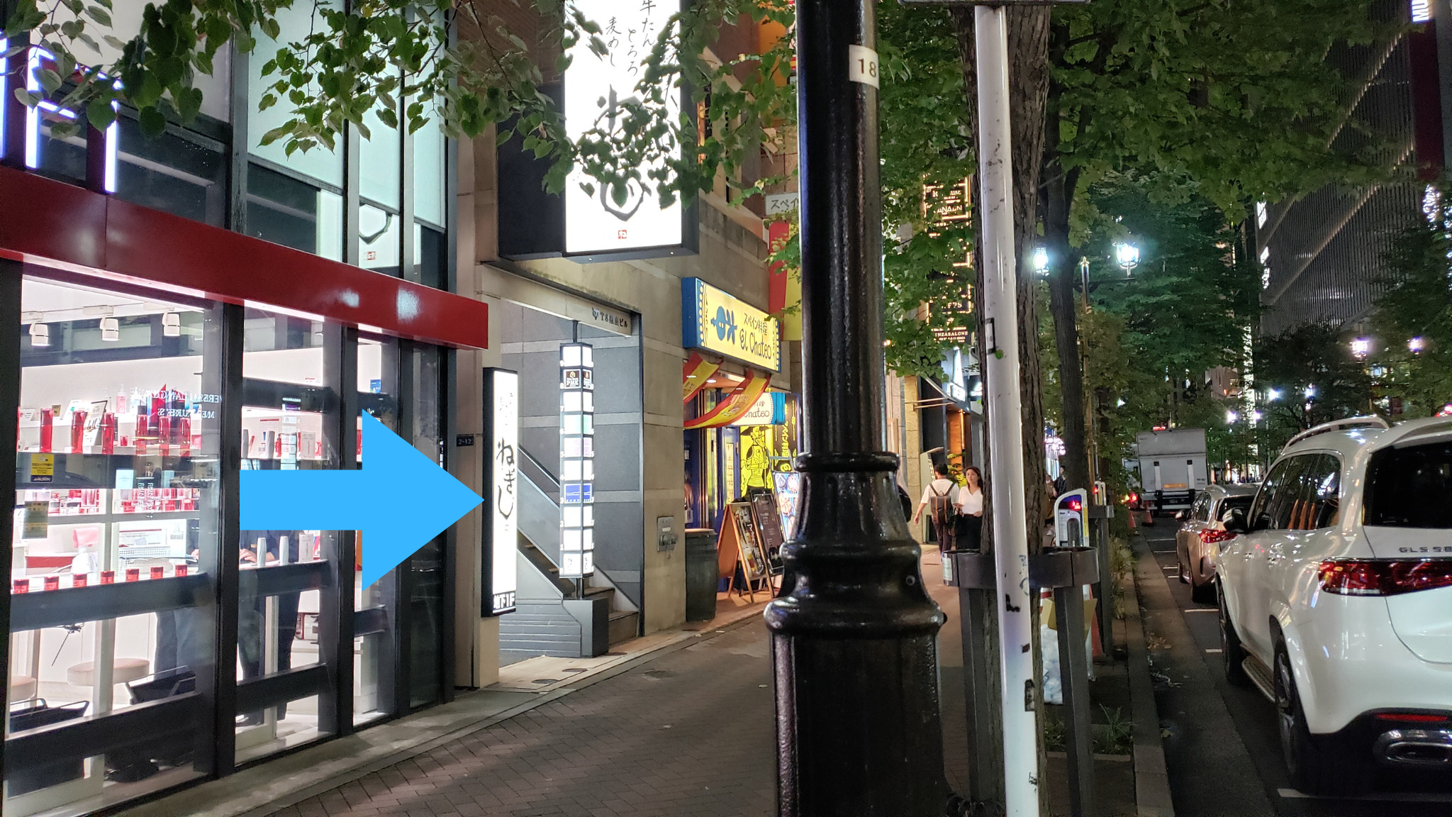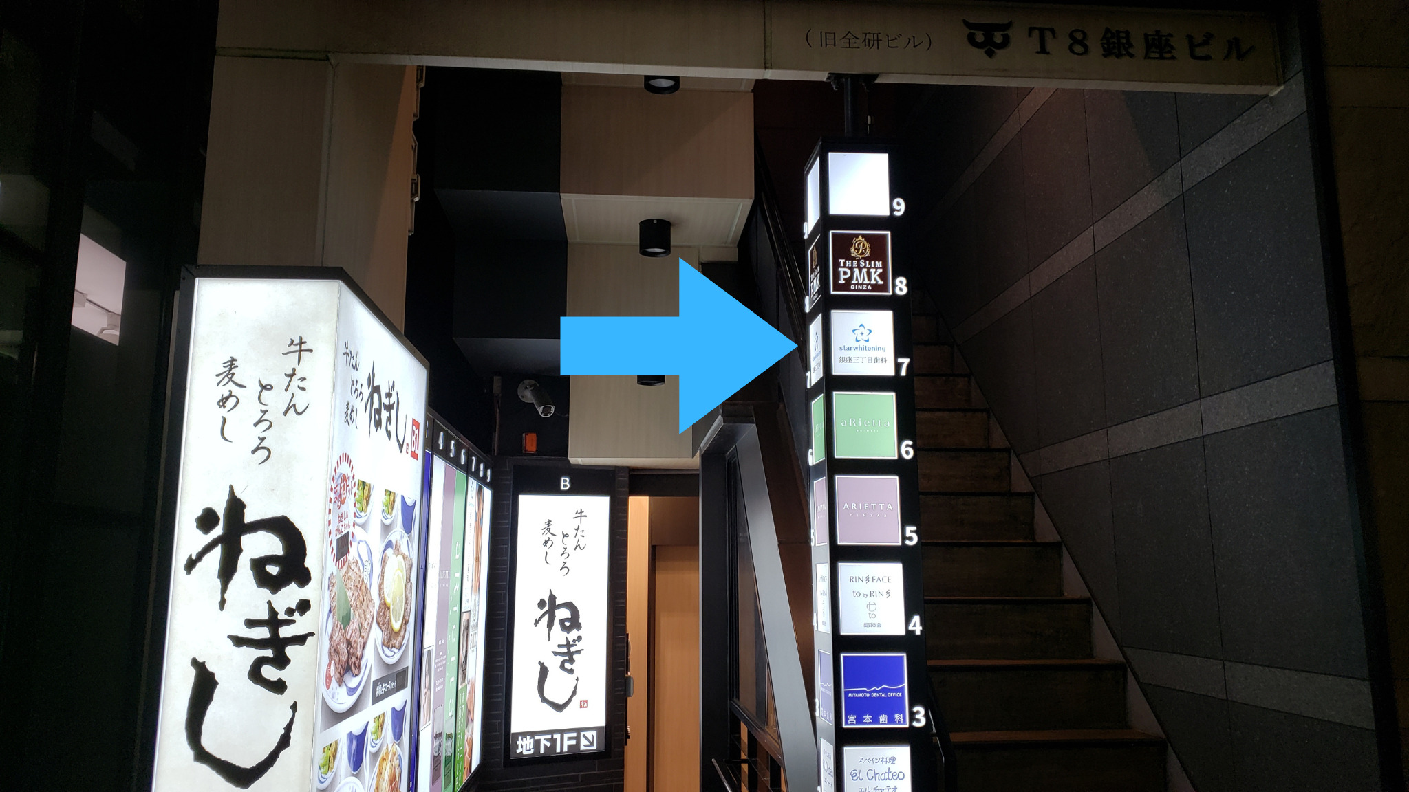 目印の建物で曲がると「ねぎし」という看板が見えます。スターホワイトニング銀座はその建物ですね。