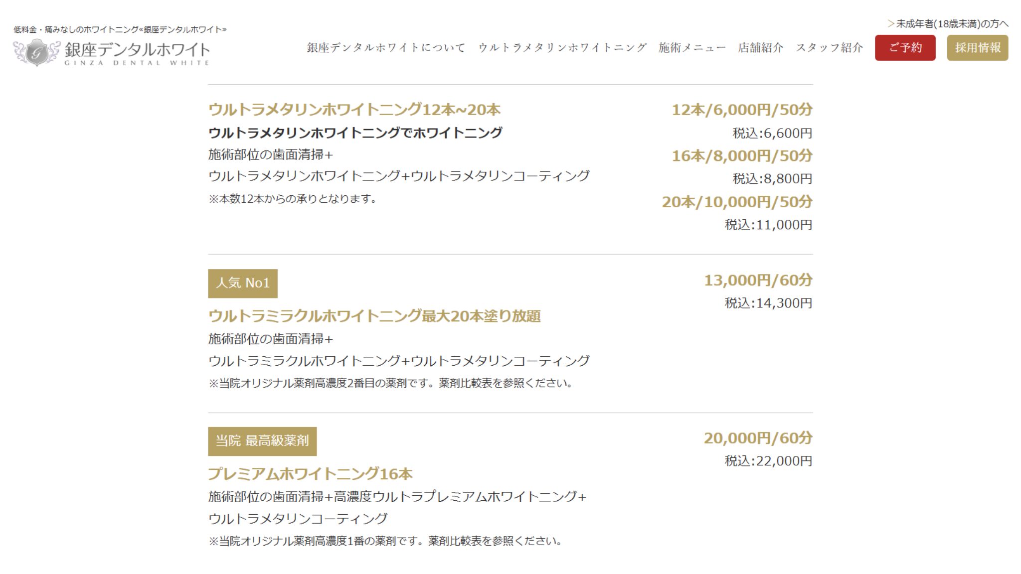 一方、銀座デンタルホワイトは「1歯500円〜」という宣伝もありますが、実際には施術範囲や薬剤の質を考慮した標準プラン(6,600円〜)が主流です。