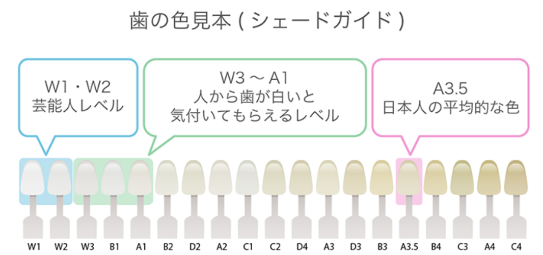 カウンセリングでは、上記のような「シェードガイド」と呼ばれる歯の色見本を使い、現在の歯の汚れ具合を確認してもらいました。
