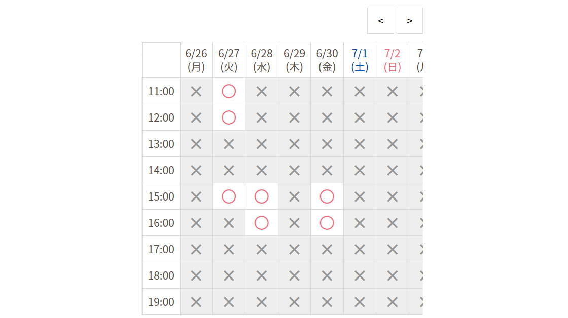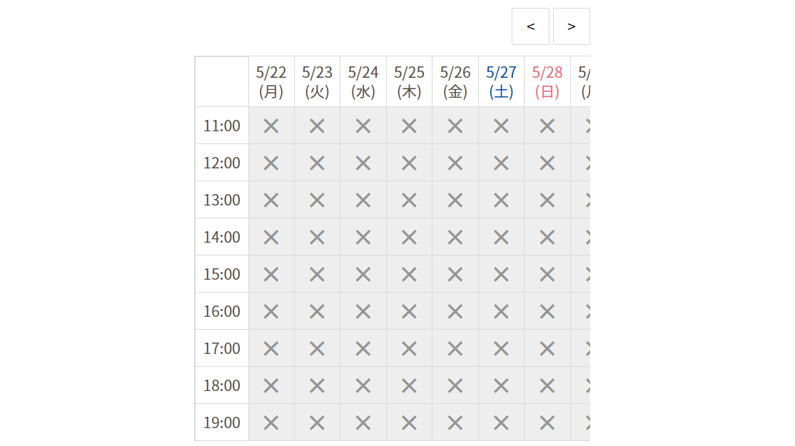 本日は2023年5月22日ですが、直近1週間の予約は全部埋まっており、最短でも約1ヵ月後の6月27日しか空いていません。