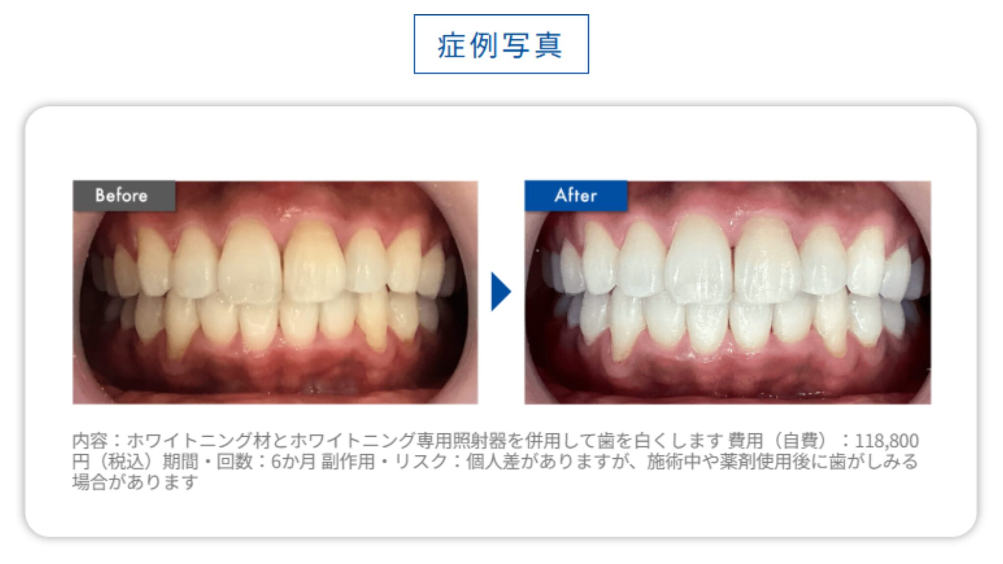 - 内容:ホワイトニング材とホワイトニング専用照射器を併用して歯を白くします